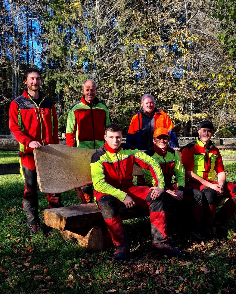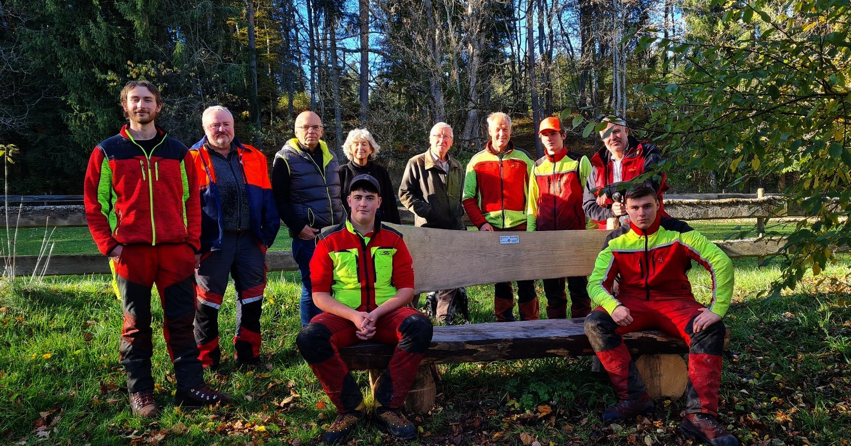 Die  Forstauszubildenden um Revierföster Wolfram Schmid hatten die Bank mit Roland Hauser gebaut und aufgestellt. Am vergangenen Freitag war die offizielle Übergabe der vom Albverein gestifteten Bank.